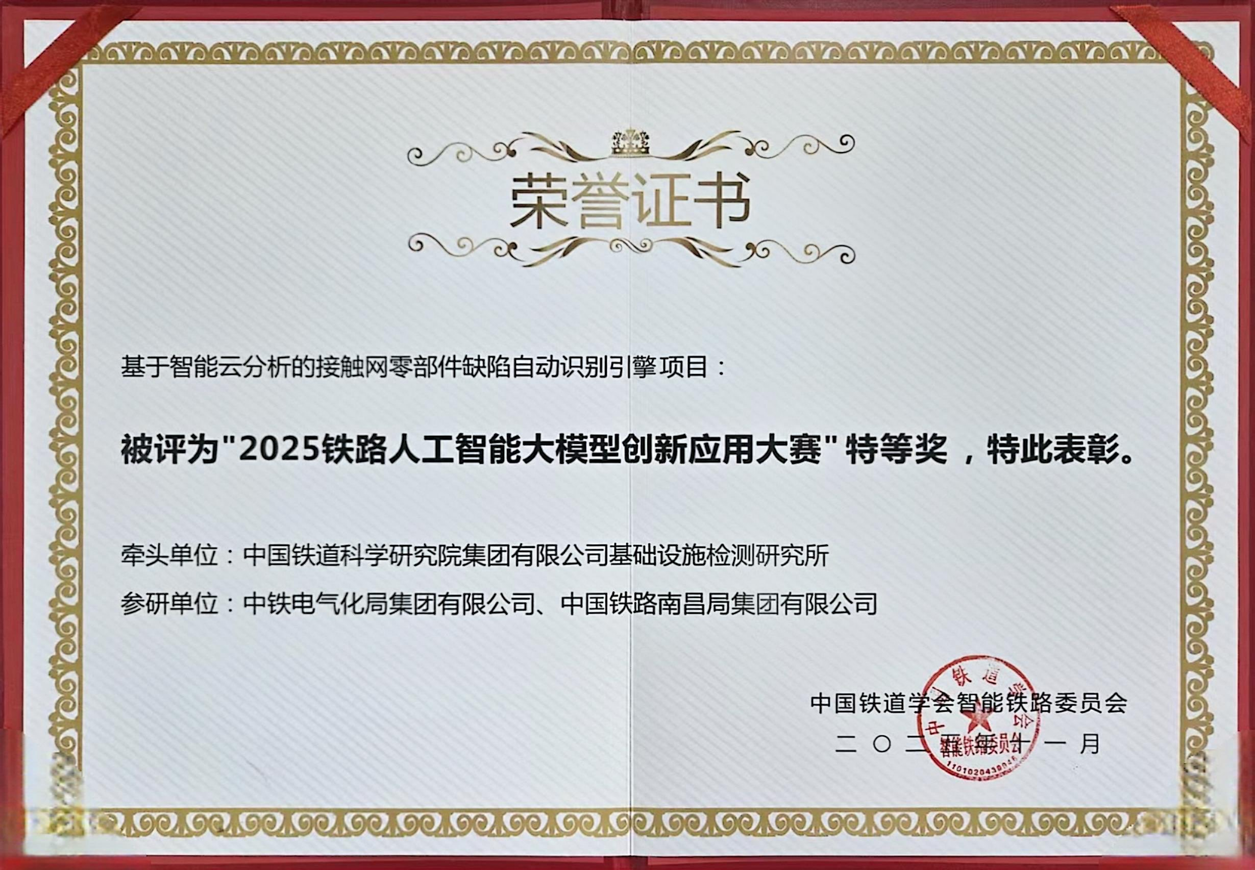 “2025铁路人工智能大模型创新应用大赛”特等奖证书
